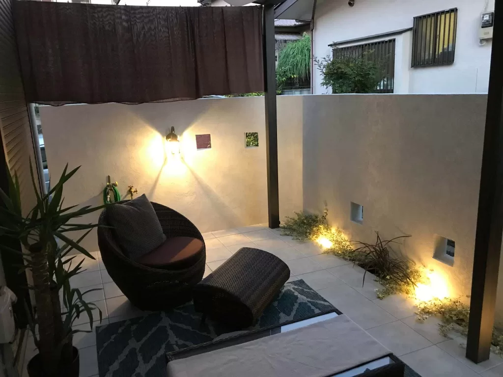 間接照明と異なるライトで幻想的な夜の空間をつくりました。アジアンテイストのソファーでくつろぎの時間を過ごせます。