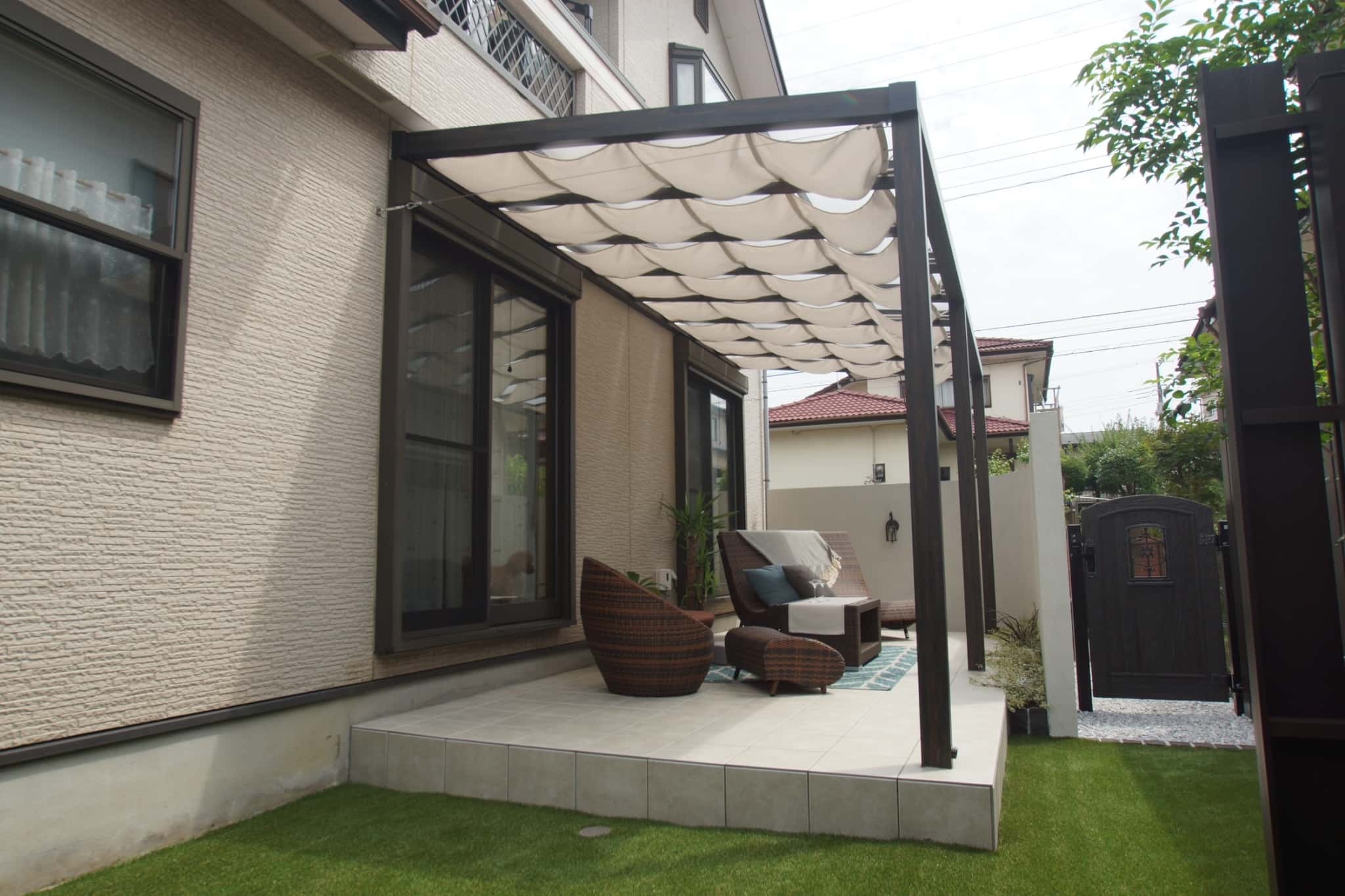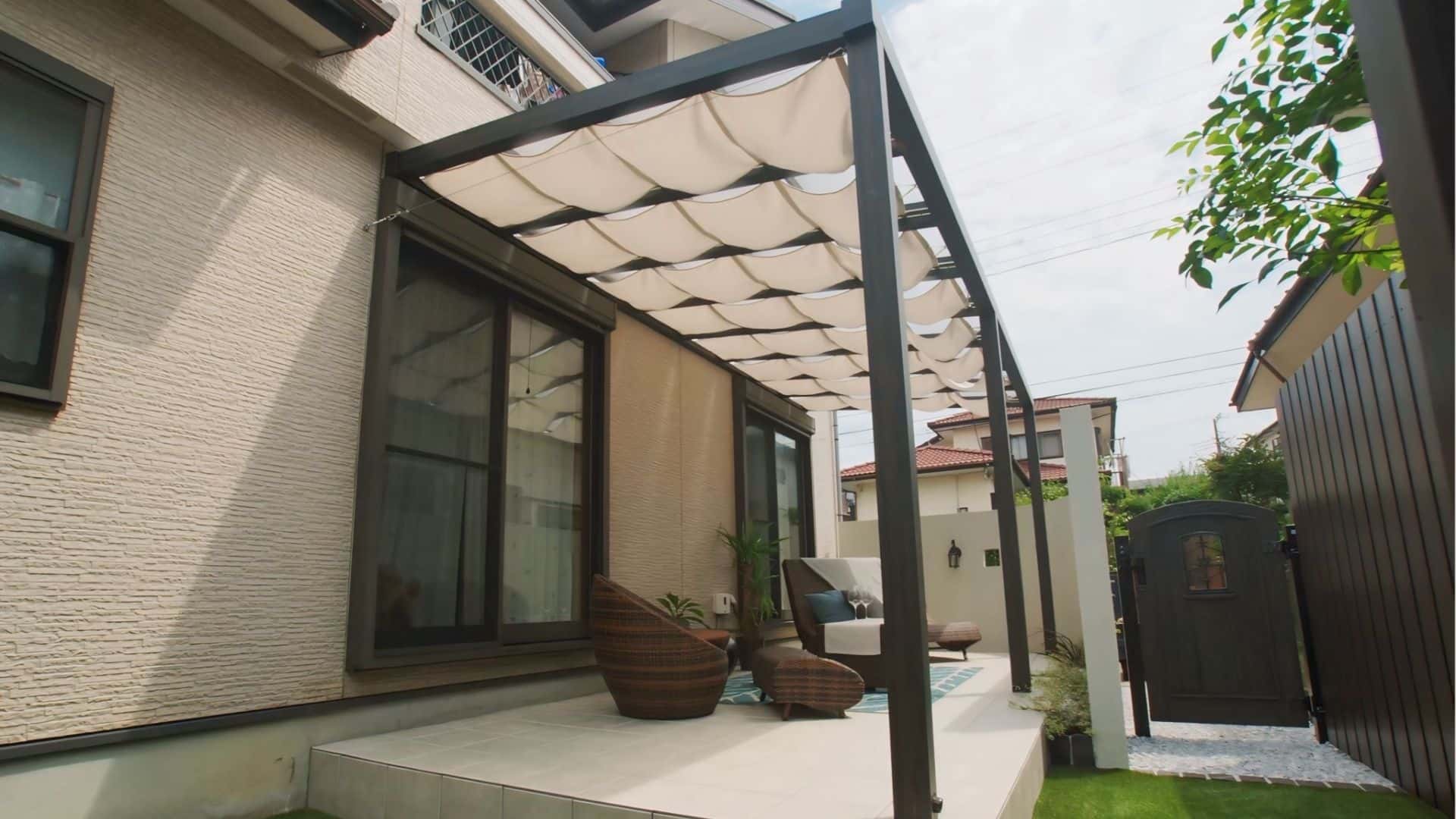 モノトーンを基調としたモダンなタイルテラス(タカショー ポーチテラス)に屋根とシェードを付けて、日差しを遮るリラックス空間に。