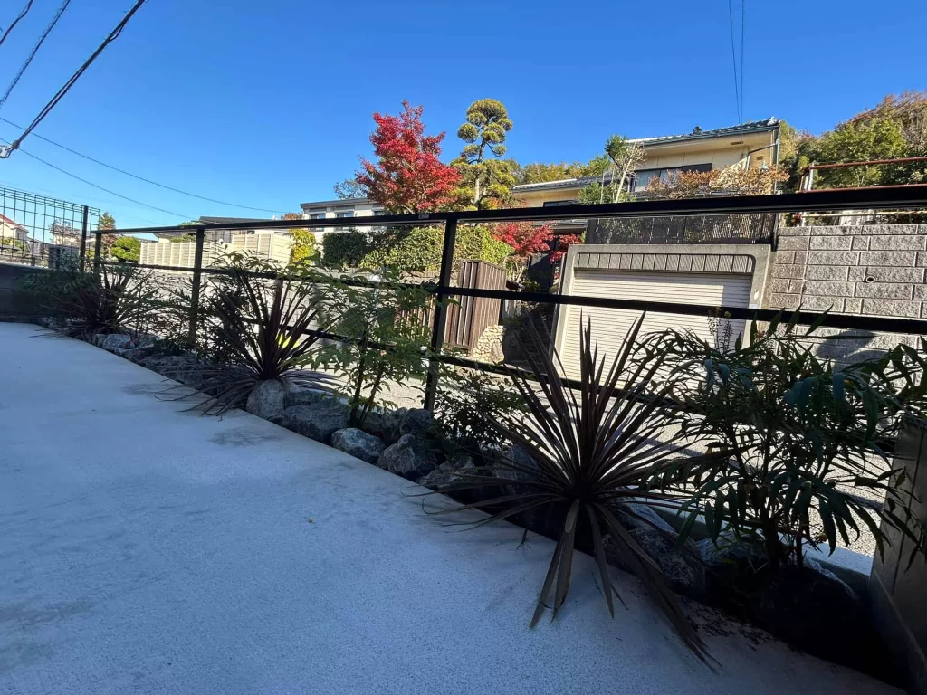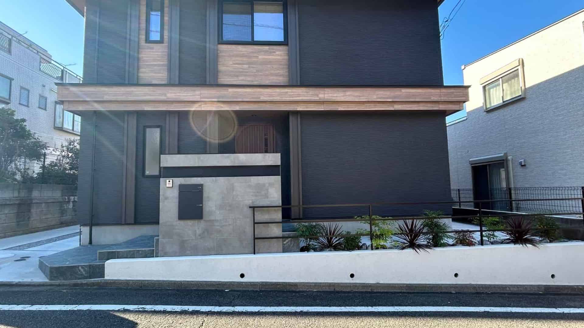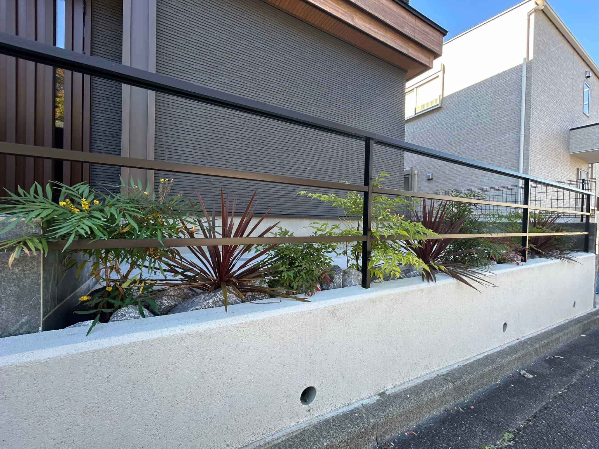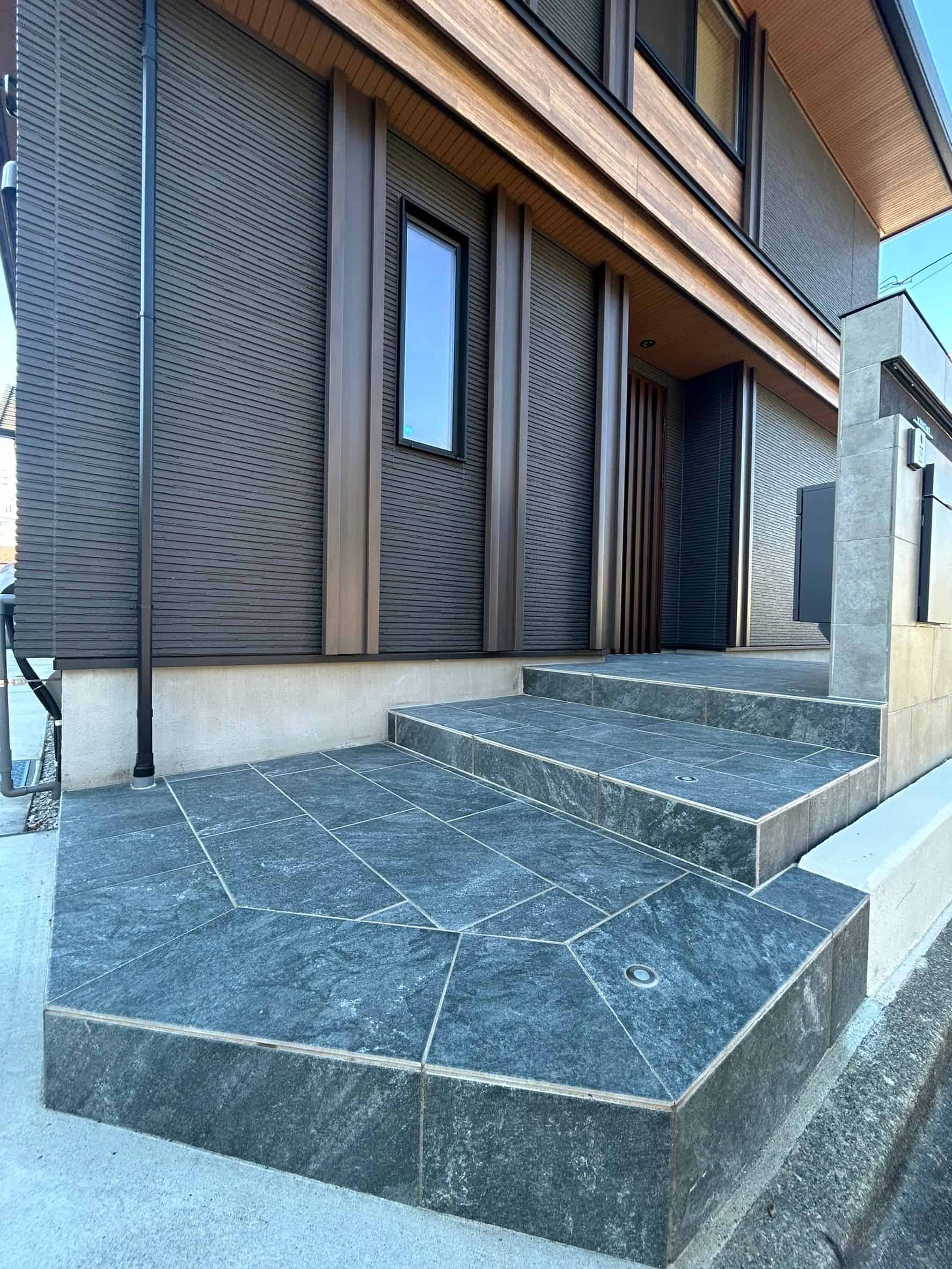 ネイビーの外壁に木彫のアクセントが美しいお家。それに合わせた外構工事を行いました。