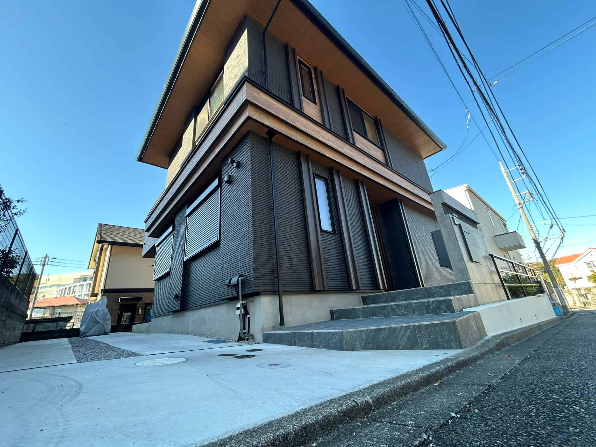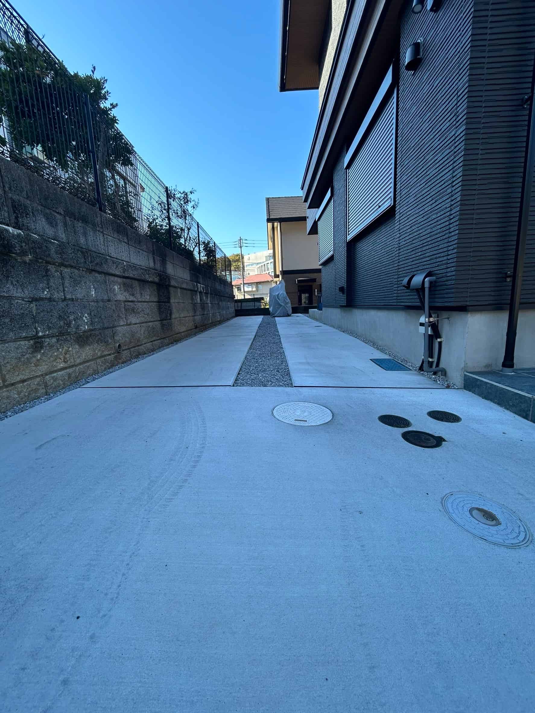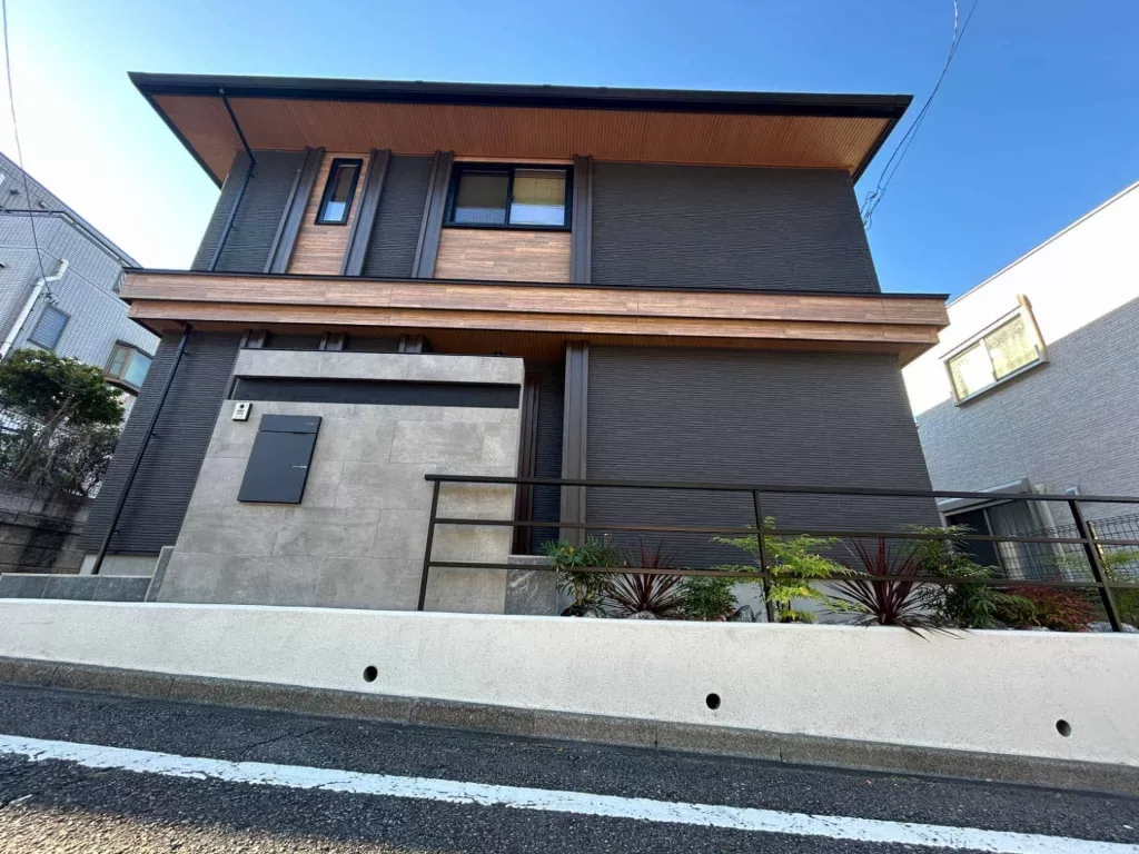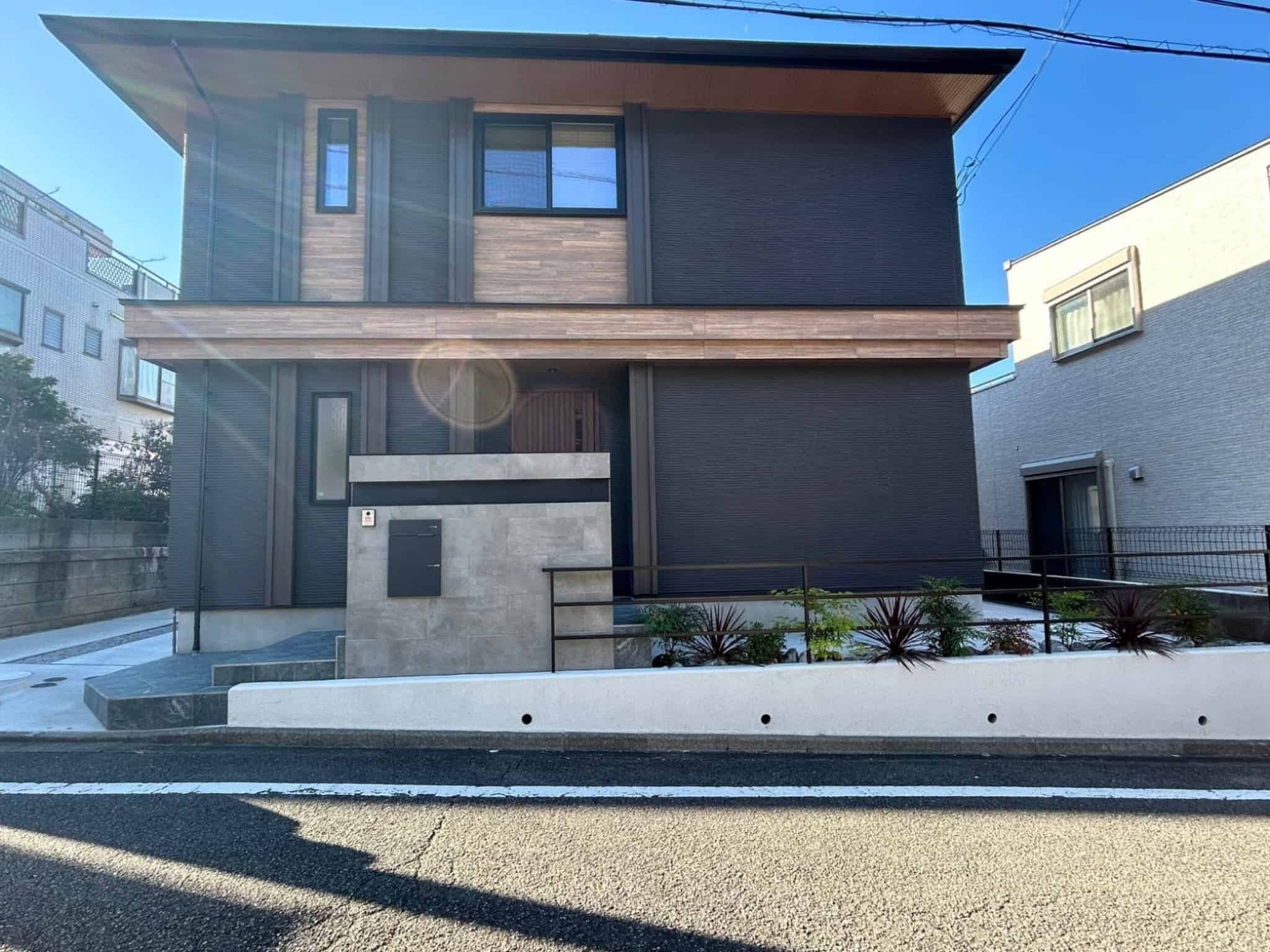 ネイビーの外壁に木彫のアクセントが美しいお家。それに合わせた外構工事を行いました。