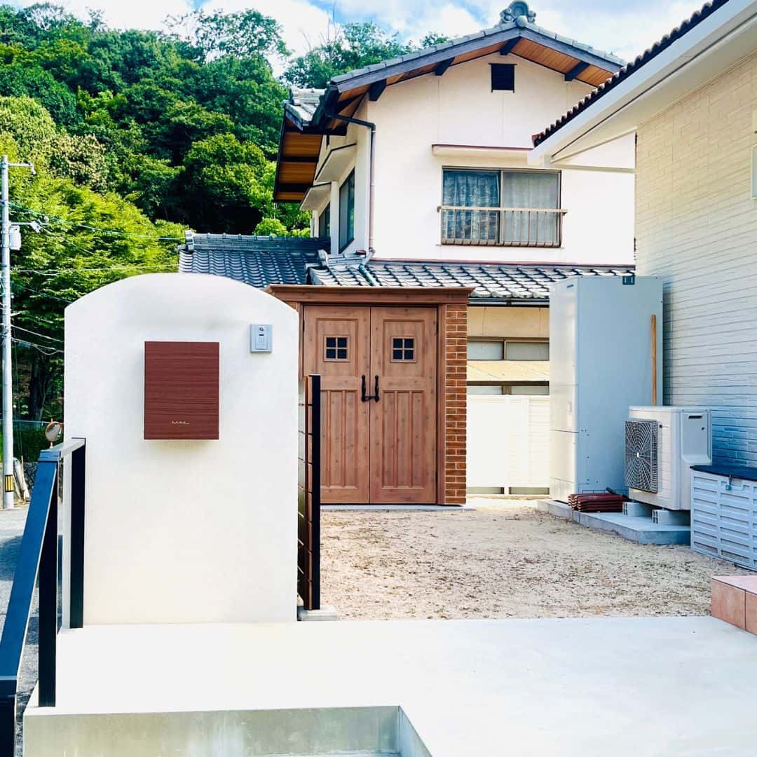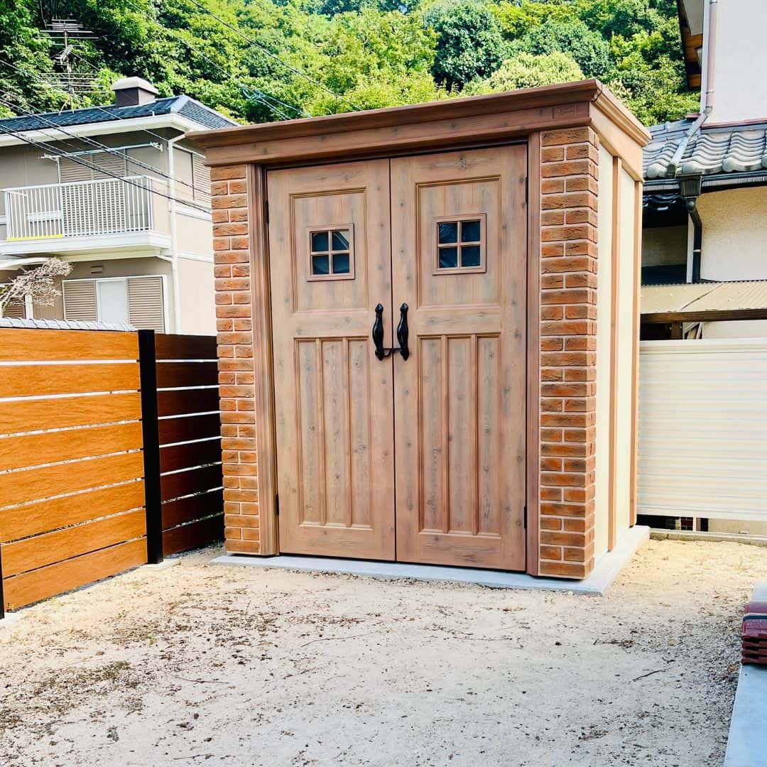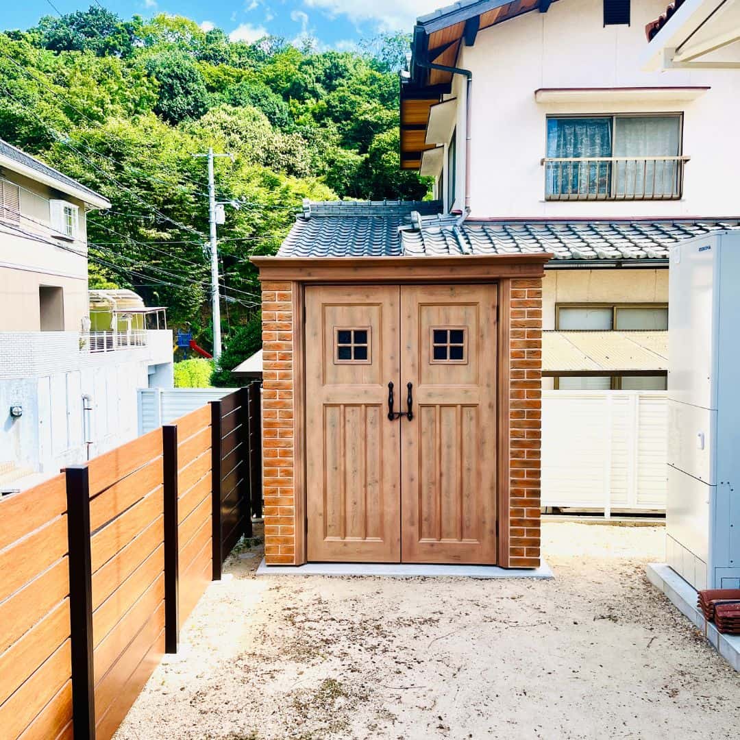 塗壁とレンガ調の外観、木調の開き扉が特徴で、小屋のように庭に溶け込むデザインです。
