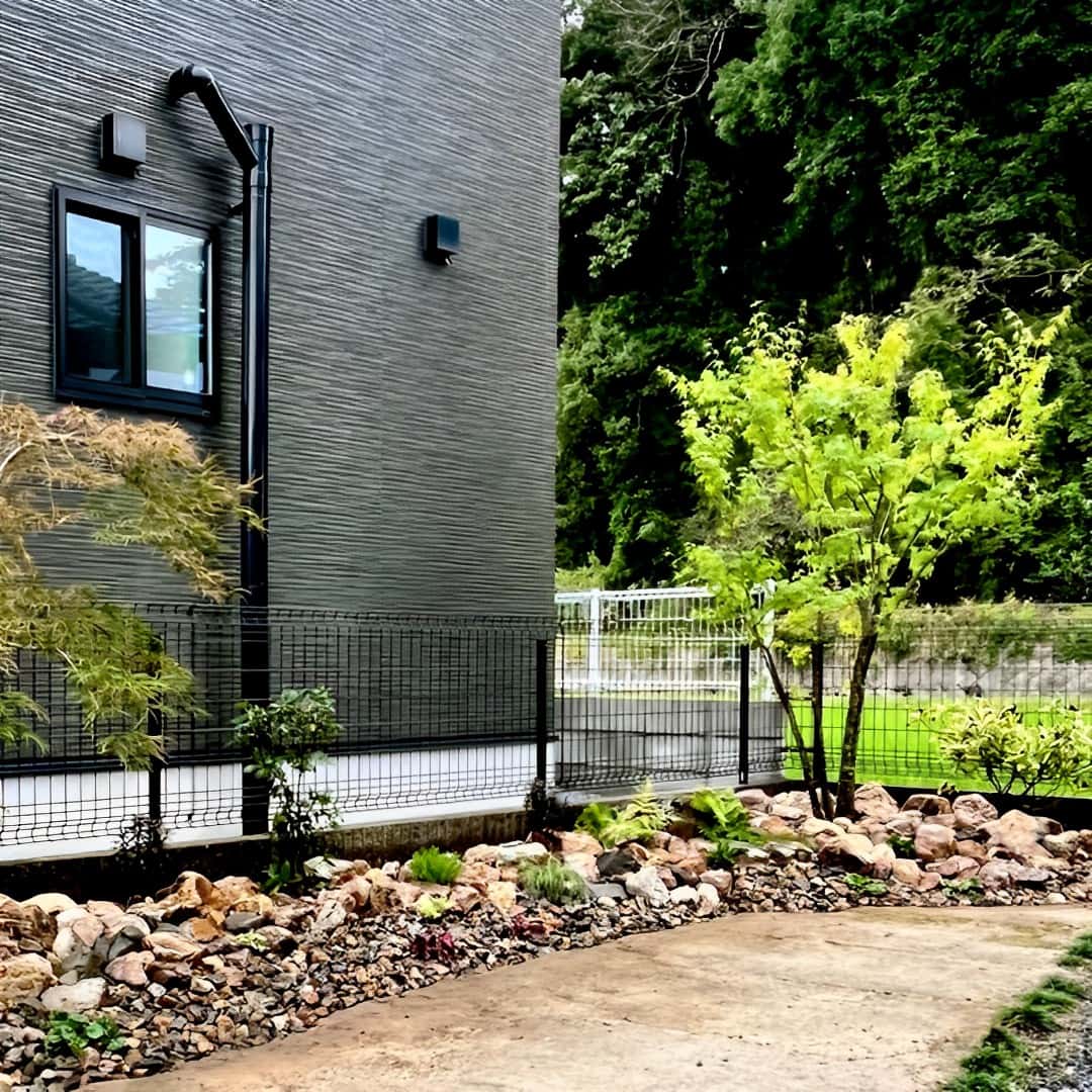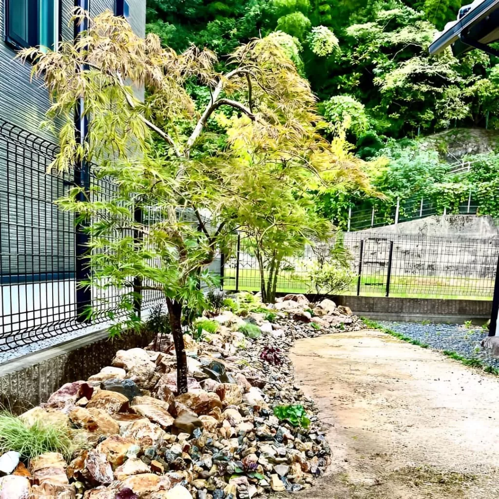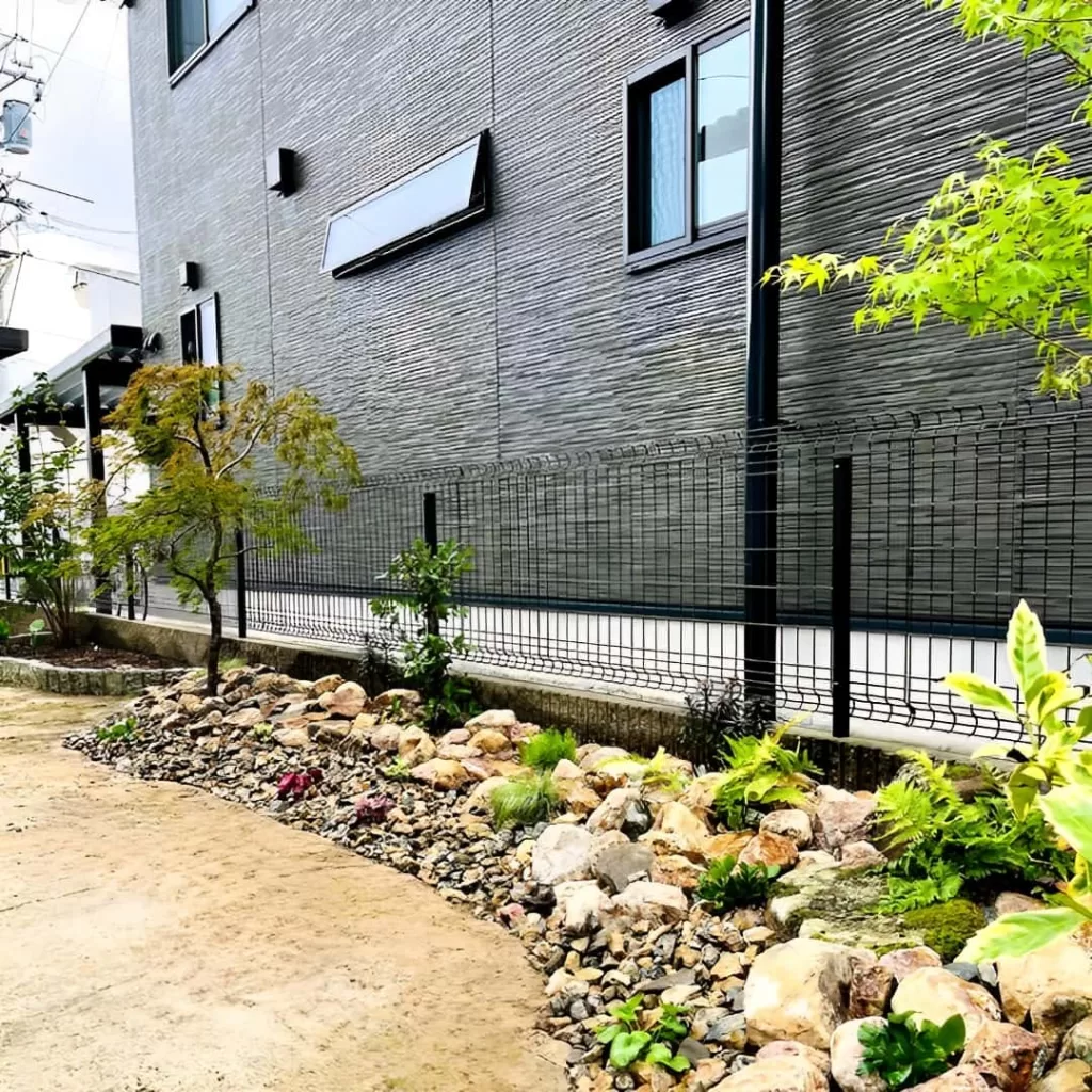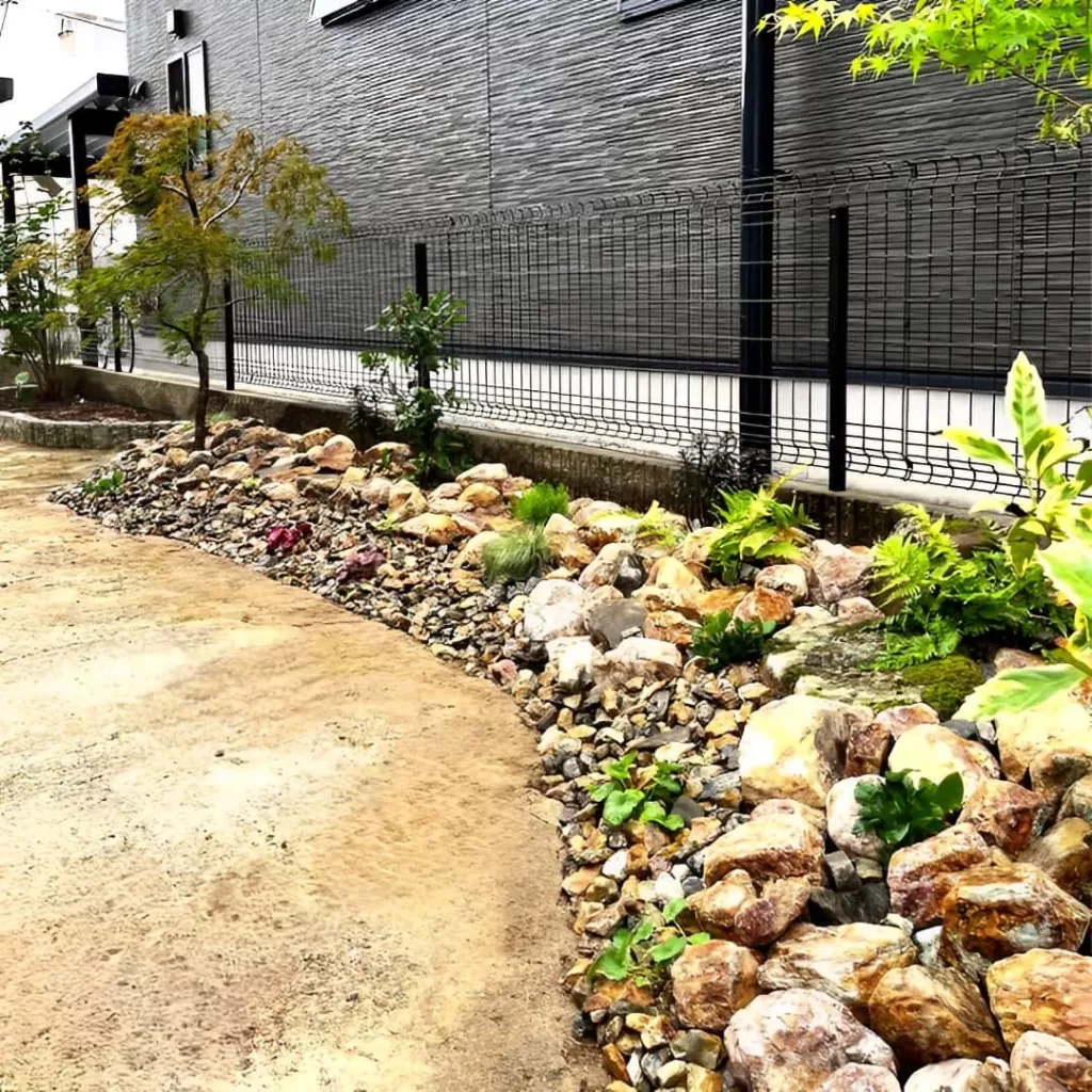 国産の珪石岩を大小ランダムに配置して立体感を演出し、その下に防草シートを敷くことで雑草対策も行いました。