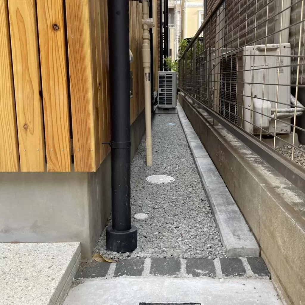 犬走は機能面を重視したドライテックを施工。雑草を生やさず、水勾配も要らないドライテックは犬走に最適です。