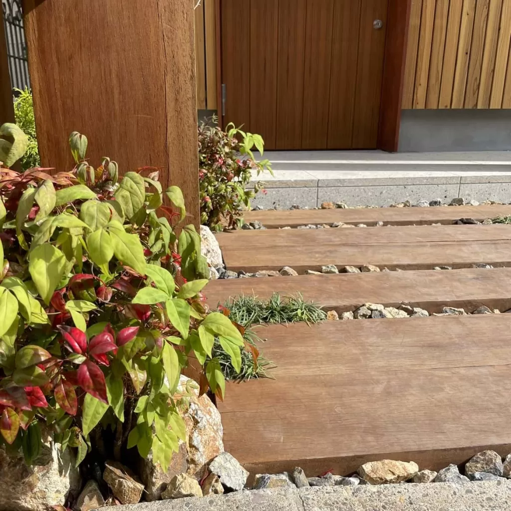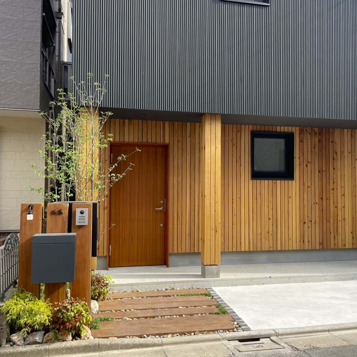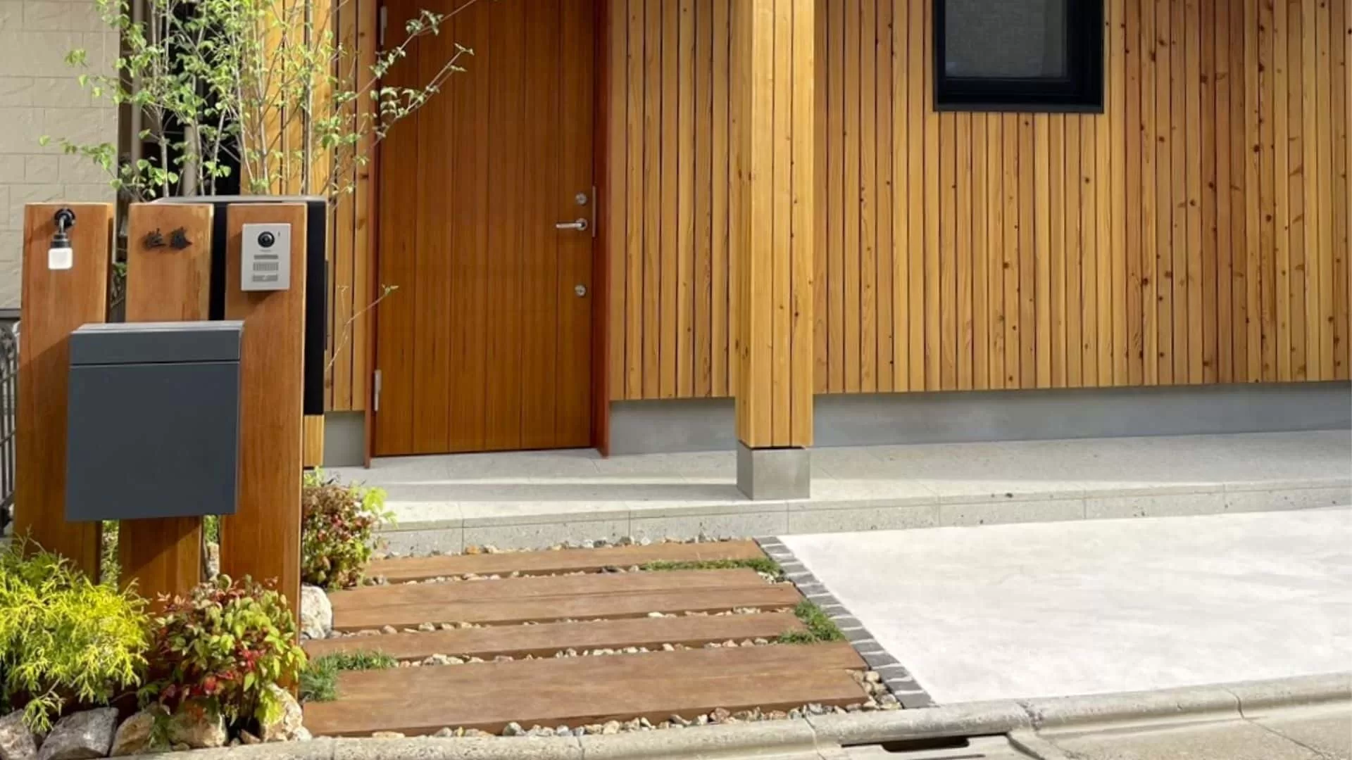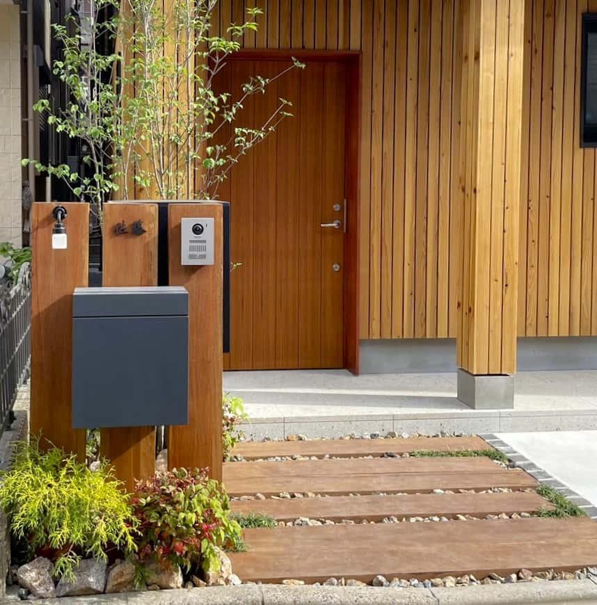 建物外観とマッチする天然木の枕木で門柱とアプローチをデザイン。