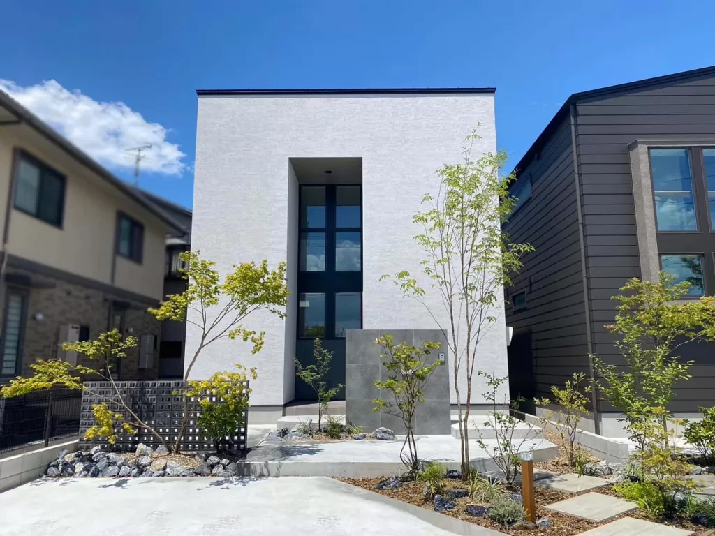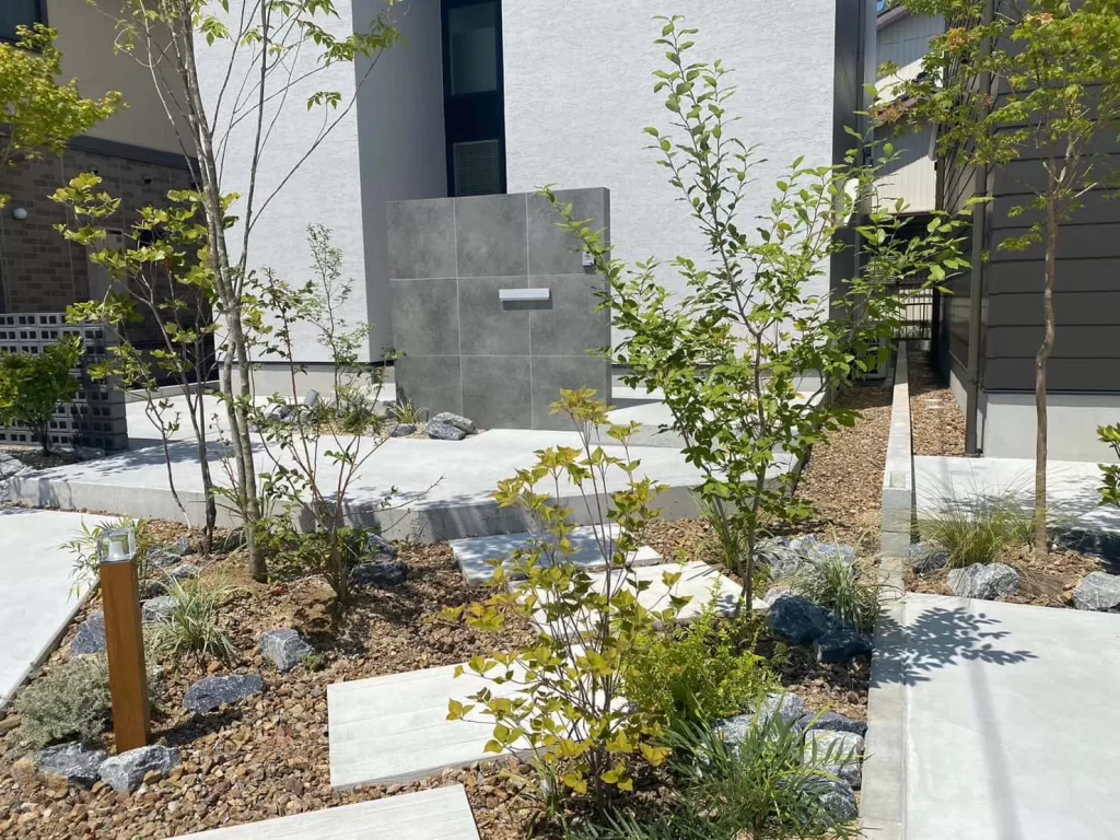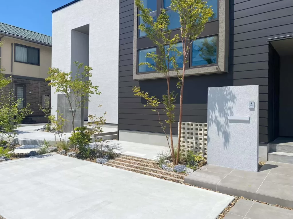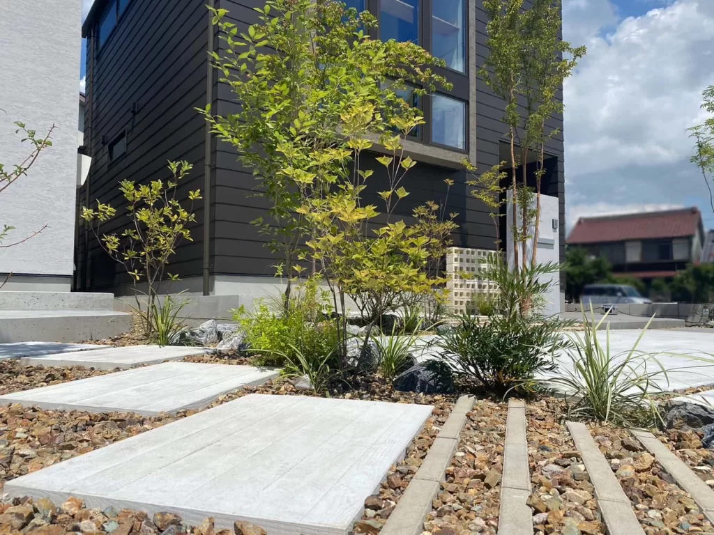 植物の緑が溢れるオープン外構、植物と外構デザインとのバランスが調和されおしゃれな空間に!