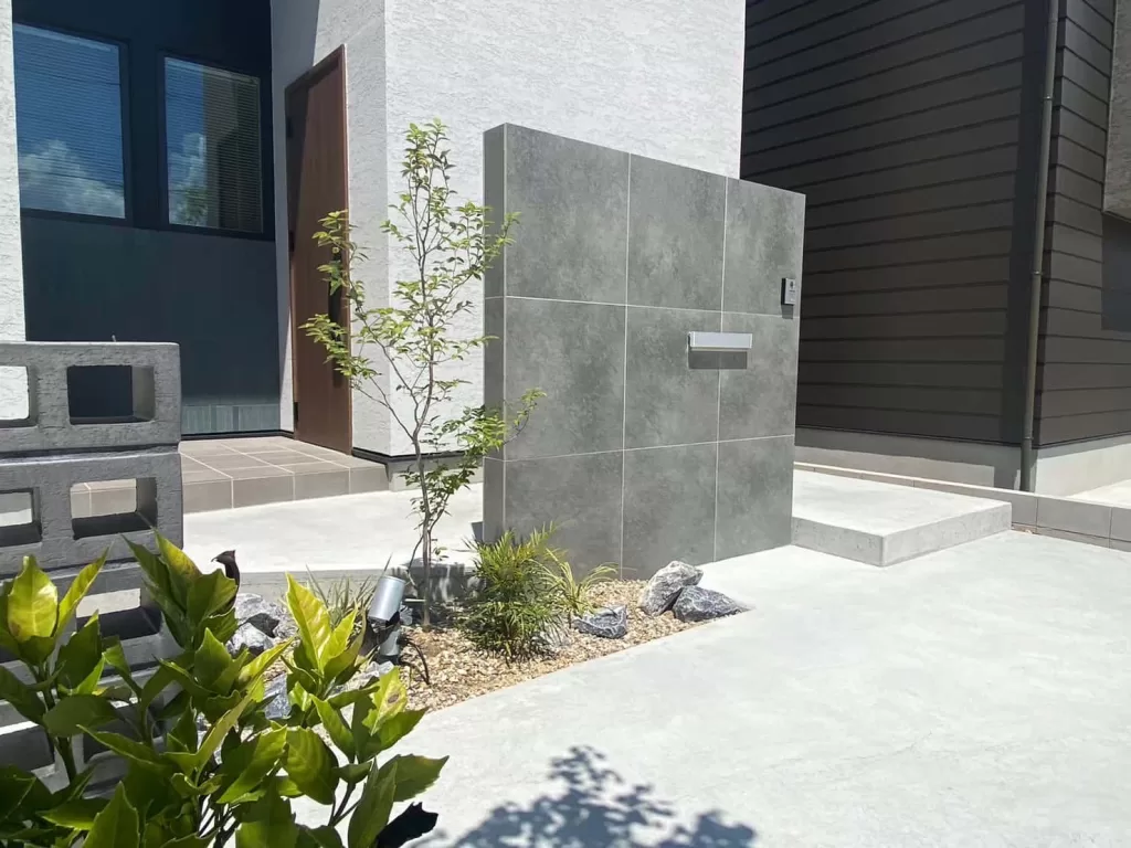 緑に囲まれ自然な空間に、インパクトのある600角タイル門柱や空洞ブロックを取り入れナチュラル過ぎない高級感ある仕上げ方に。