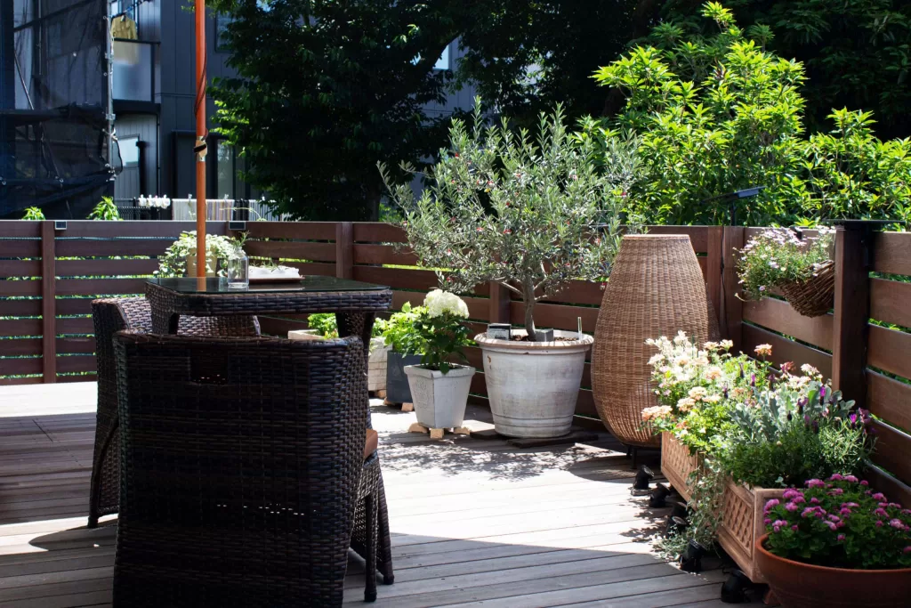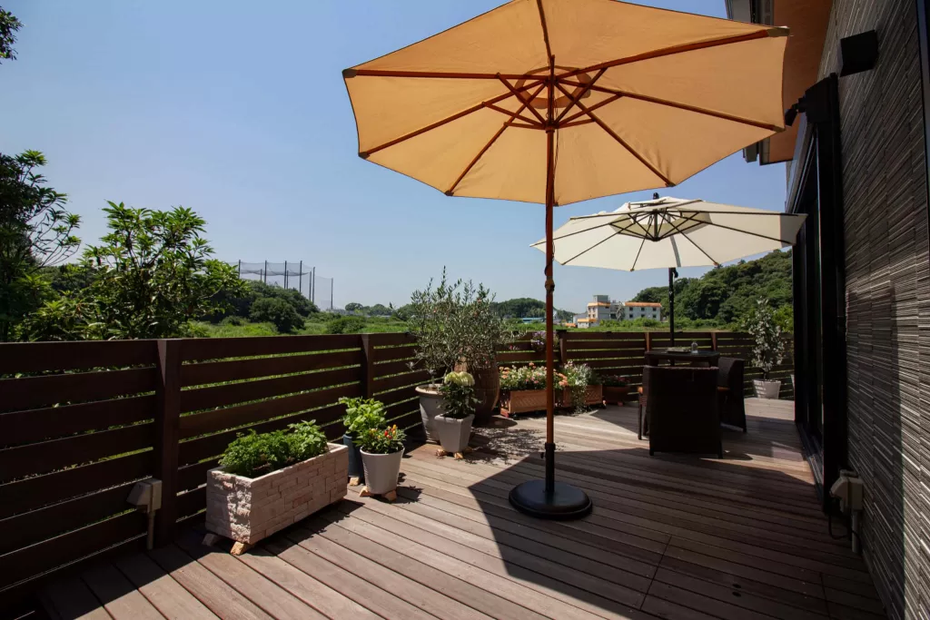 広々とした空間に設置されたパラソルやガーデンファニチャーは、家族や友人と過ごすひとときをさらに豊かにします。