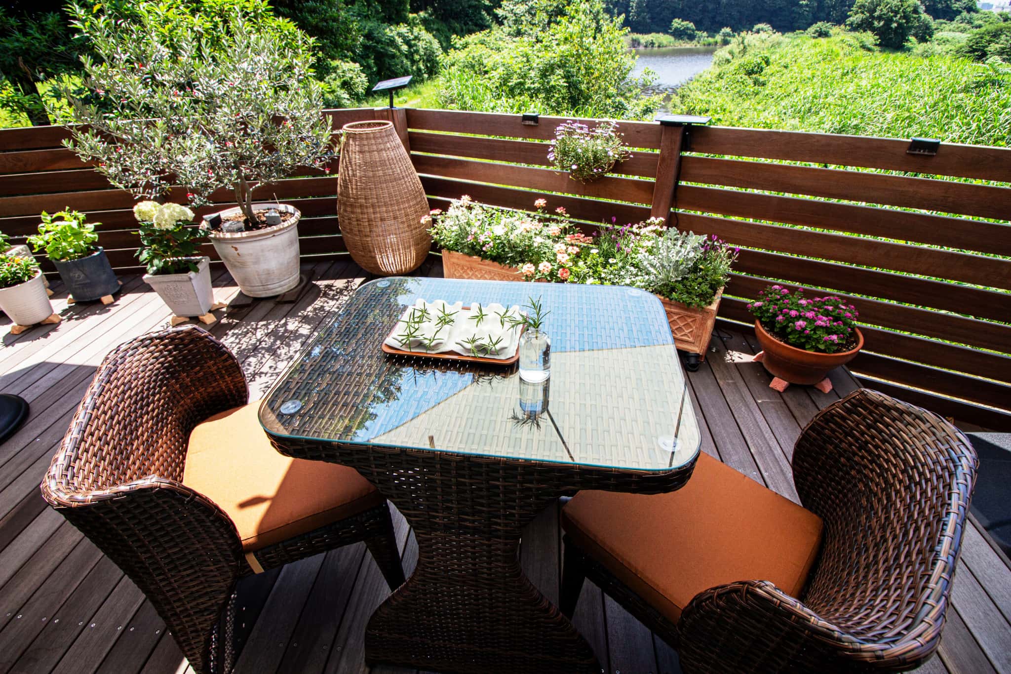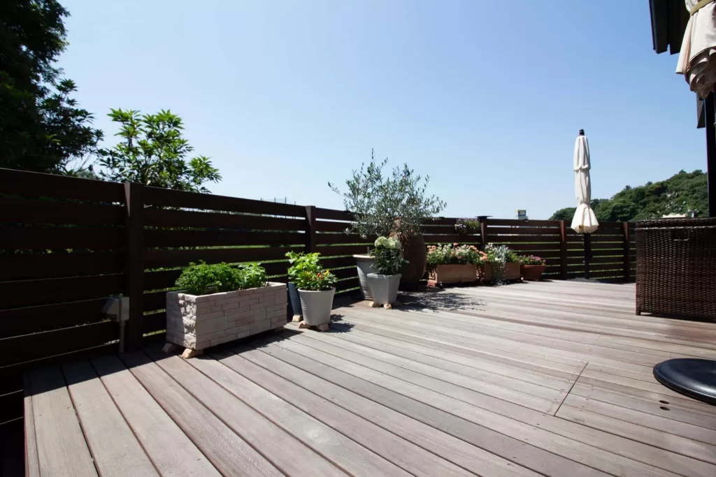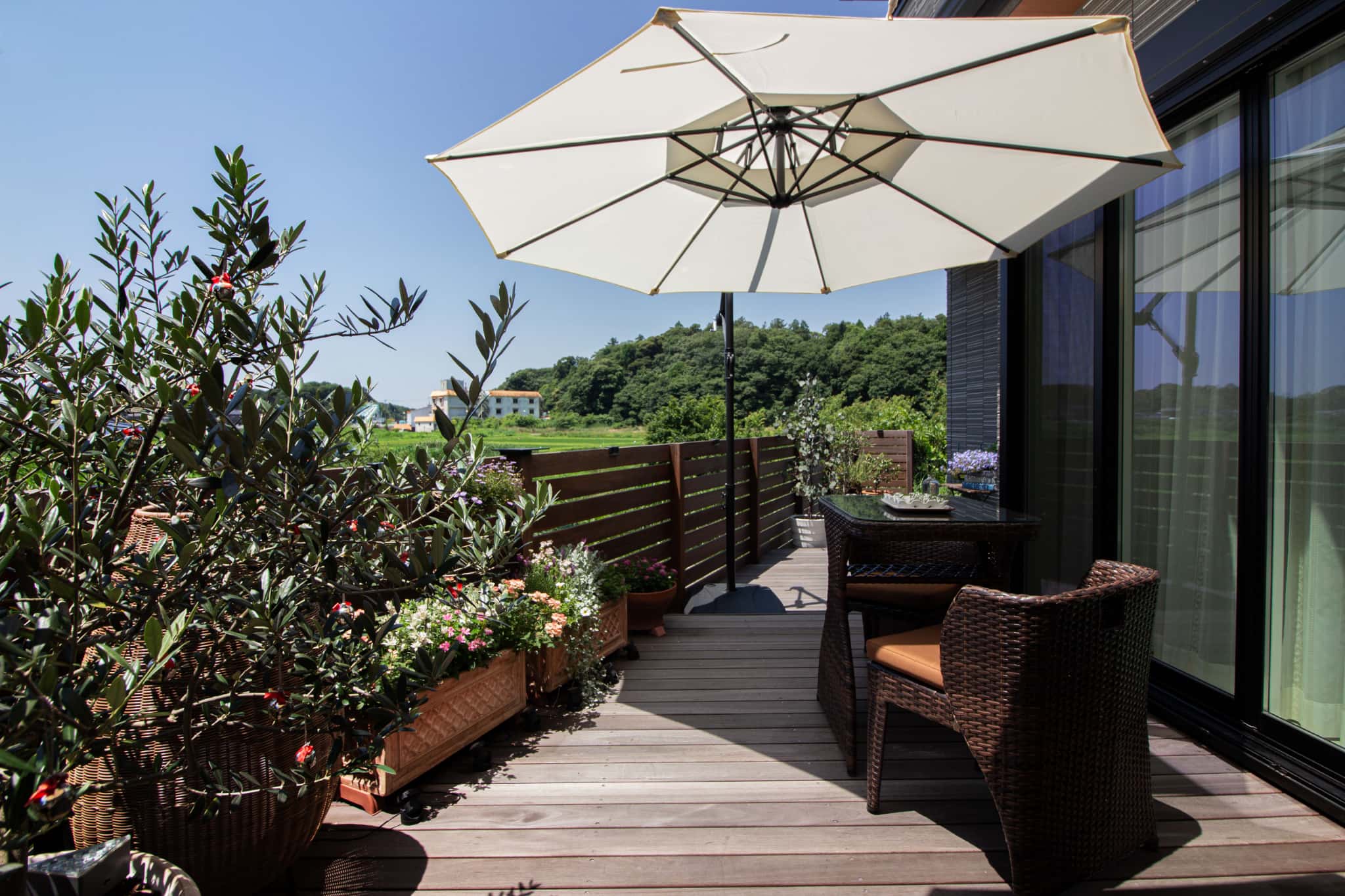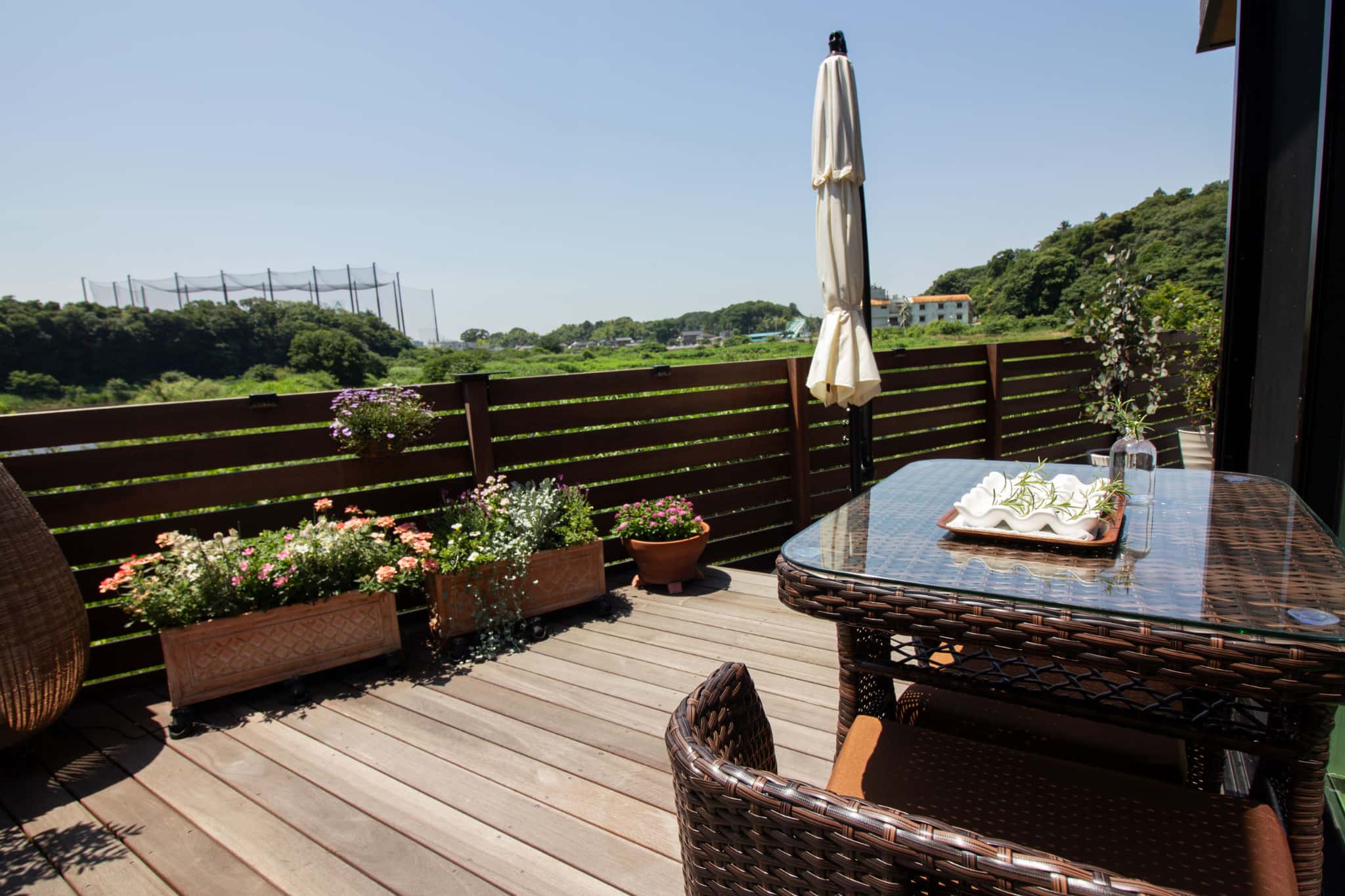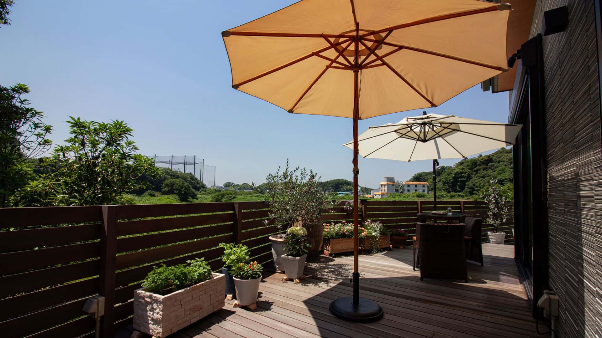 ウッドフェンスでプライバシーを守りながらも、視線の先には自然豊かな美しい景色が広がります。