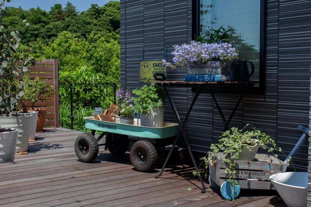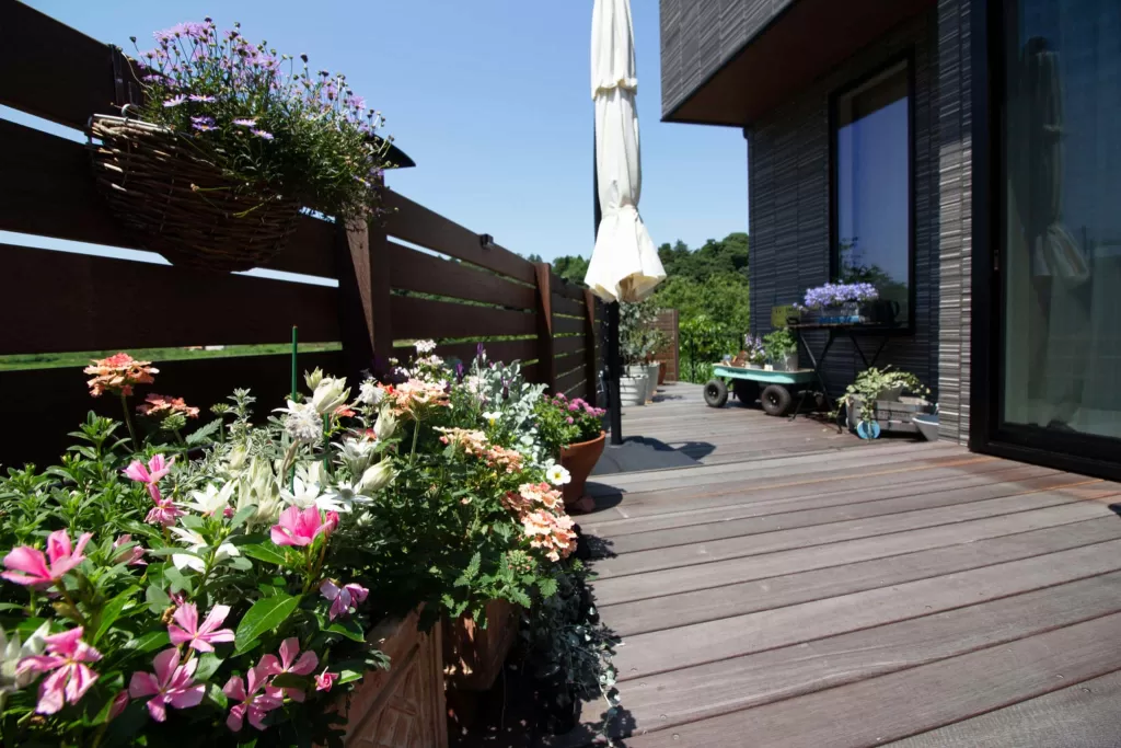 開放感あふれるウッドデッキが魅力の外構デザイン。